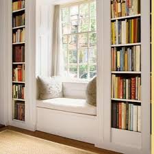 The bookshelves were looking more complete with the window seat now in. Our selection of bookcases come in many different shapes and sizes. This window seat bookcase appears built into the home.