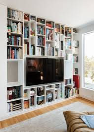 Fancy a wall to wall library or do you like to mix your tv or family photos with your books. In open concept lofts like this one the utilitarian mudroom shares space with more decorative elements like these built in white shelves with a storage bench. Bookcase 60x180 cm 39.