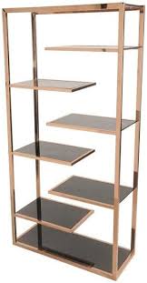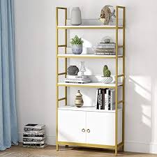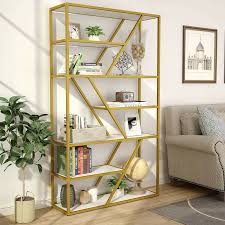 Made of manufactured wood in a glossy black or warm rustic oak finish five rectangular shelves provide perfect platforms for displaying everything from rows of your favorite reads to blooming potted plants to collected curios. Crafted of tubular metal in an aged gold finish this bookcase s frame strikes an open rectangular silhouette with an x brace. Tribesigns bookshelf bookcase gold 8 open shelf etagere bookcase with faux marble modern book shelves display shelf storage organizer for home office 4 3 out of 5 stars 36 159 99 159.