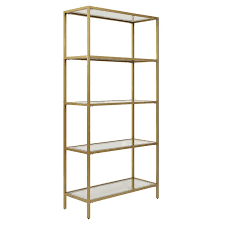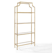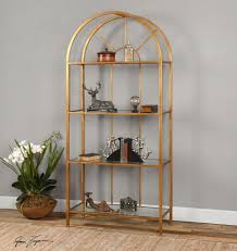 All feature metal frames and glass shelves. 4 shelf vintage industrial bookcase glass gold metal open bookshelf antique rack. Metal glass bookcase in antique gold pemberly row.